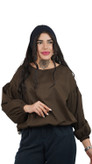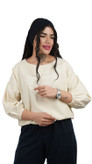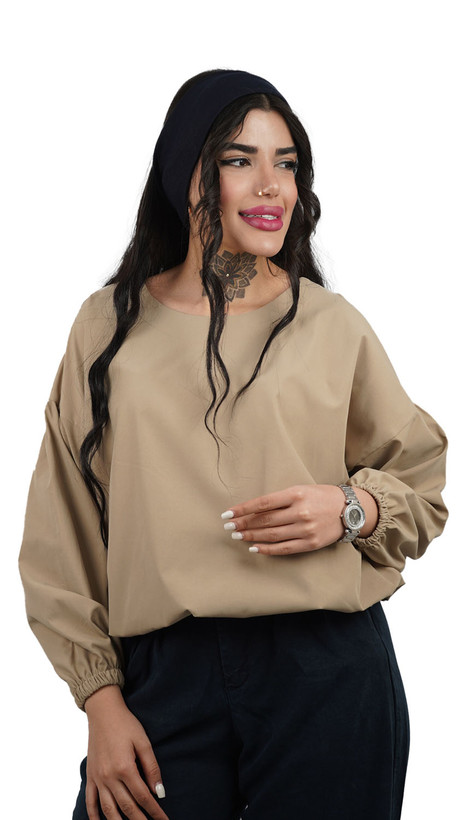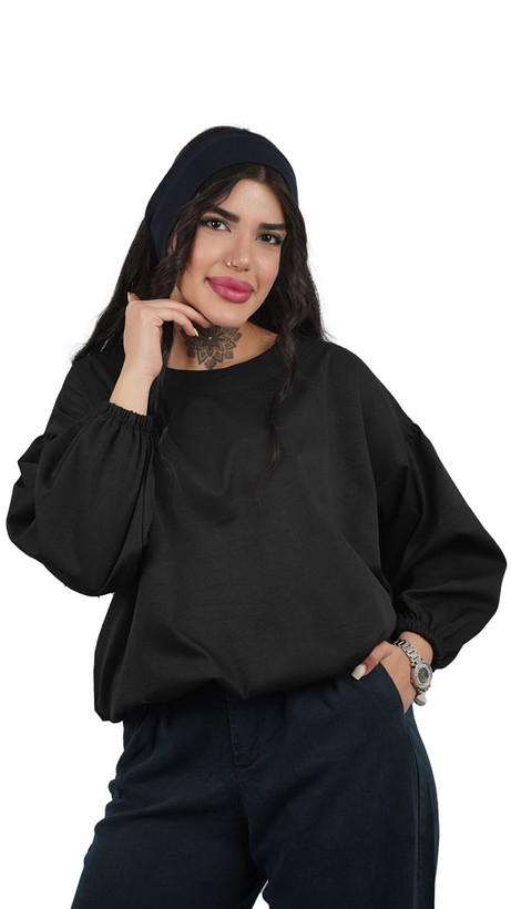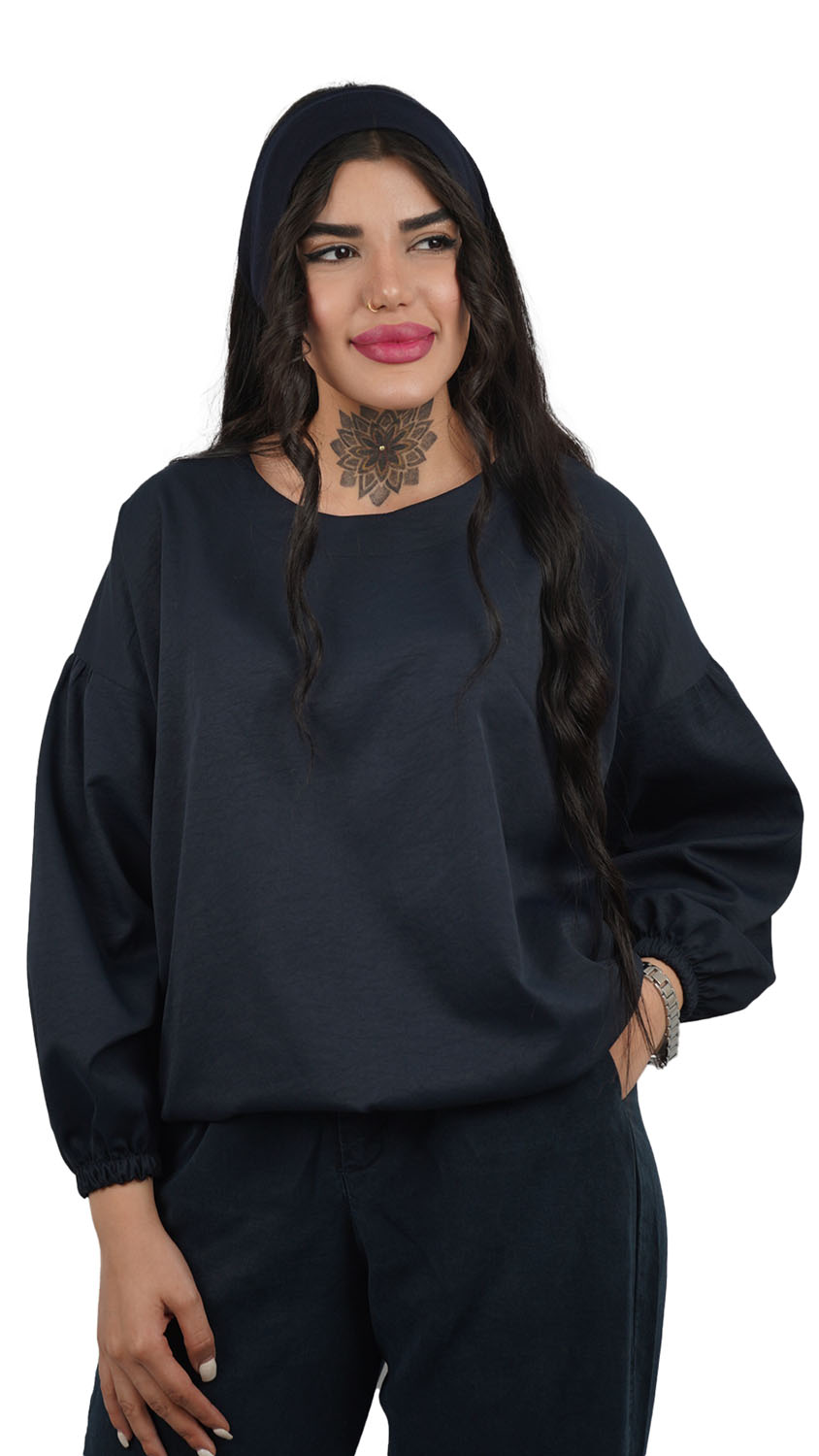 مدل آستین: ویژگی برجسته این بلوز، آستینهای بلند و پفدار است که در مچ با کش دوخته شده و حالت بلیزون (Blouson) یا پفی ایجاد میکند. این مدل آستین، حجم و جذابیت بصری به لباس میافزاید.