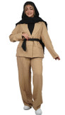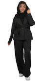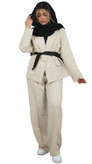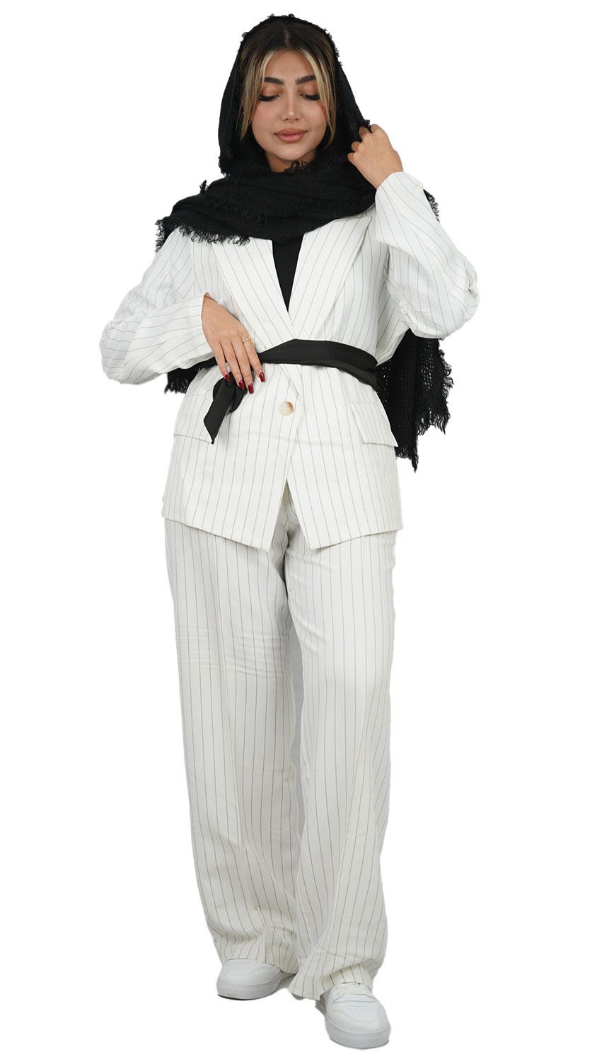 استایلینگ و اکسسوری: برجستهترین عنصر استایل، یک کمربند پارچهای مشکی پهن است که دور کمر کت بسته شده و فرم A-Line را به بالاتنه داده و کمر را مشخص میکند. مدل با شال/روسری مشکی و کفش سفید استایل شده است.
