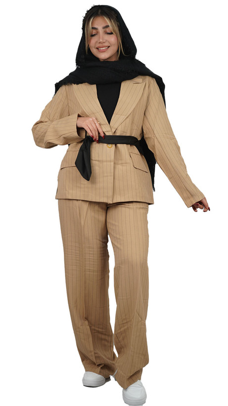 طرح و جنس: پارچه دارای خطوط عمودی بسیار نازک و تکرارشونده (Pinstripe) است که عمود بر زمین بوده و خطای دیدی برای بلندتر نشان دادن قد ایجاد میکند.